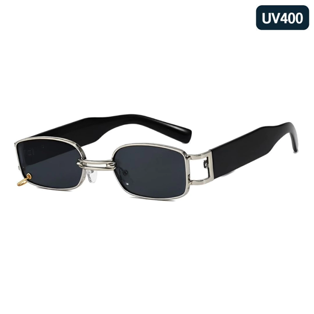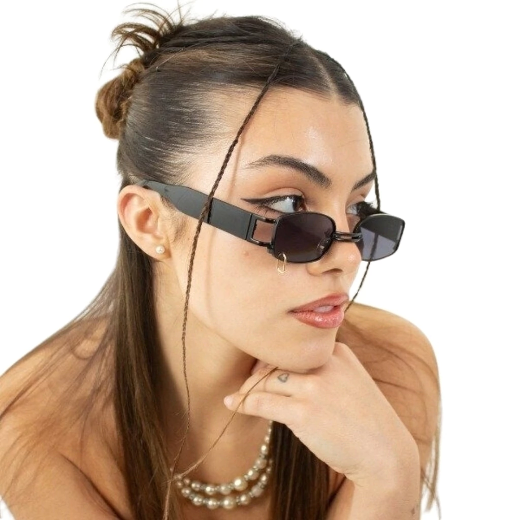 Estas gafas de sol destacan por su montura metálica dorada/negra de forma rectangular y una barra adicional sobre el puente, dándoles un diseño distintivo y moderno. Las varillas negras contrastan con el marco metálico, creando un accesorio elegante y atemporal, perfecto para cualquier estilo.