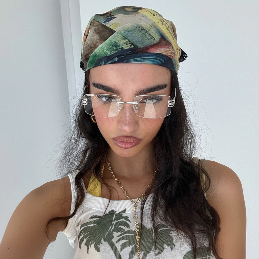 Los lentes Texas son un modelo de anteojos sin montura de diseño elegante y minimalista. Sus lentes, de forma rectangular y bordes suaves, se sujetan con un discreto puente metálico en el centro y unas varillas que se extienden desde las esquinas superiores. Estas varillas, con un distintivo detalle en forma de "V" doble, combinan un acabado plateado con terminales de un tono blanco o hueso, creando un contraste sutil que resalta su estilo moderno y ligero. Podes encntrarlo en modelo Gafa de Sol, con un acabado Negro con detalles Animal print y un lente oscuro.